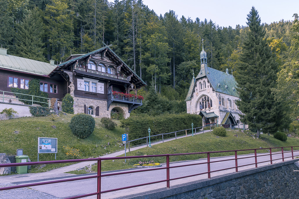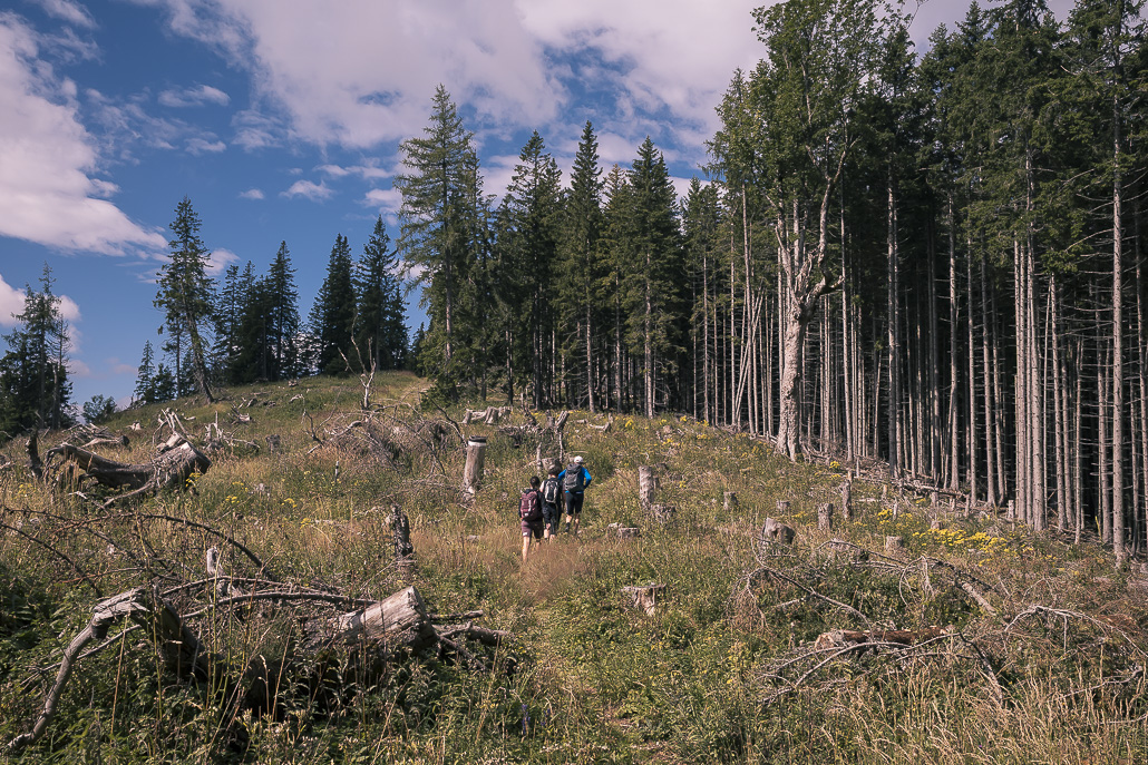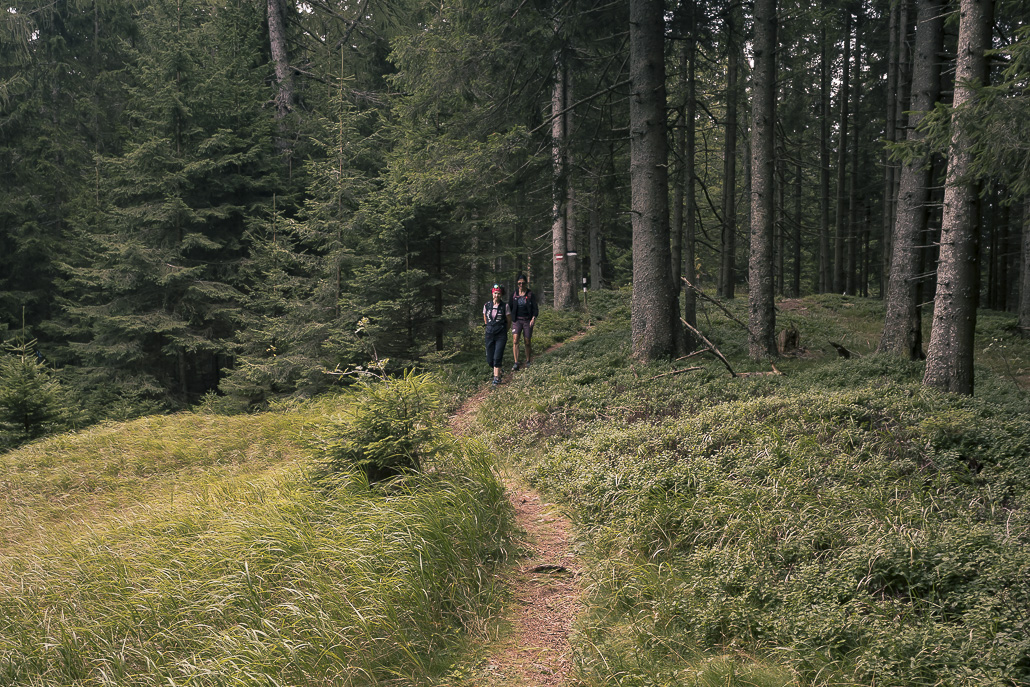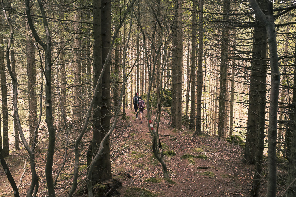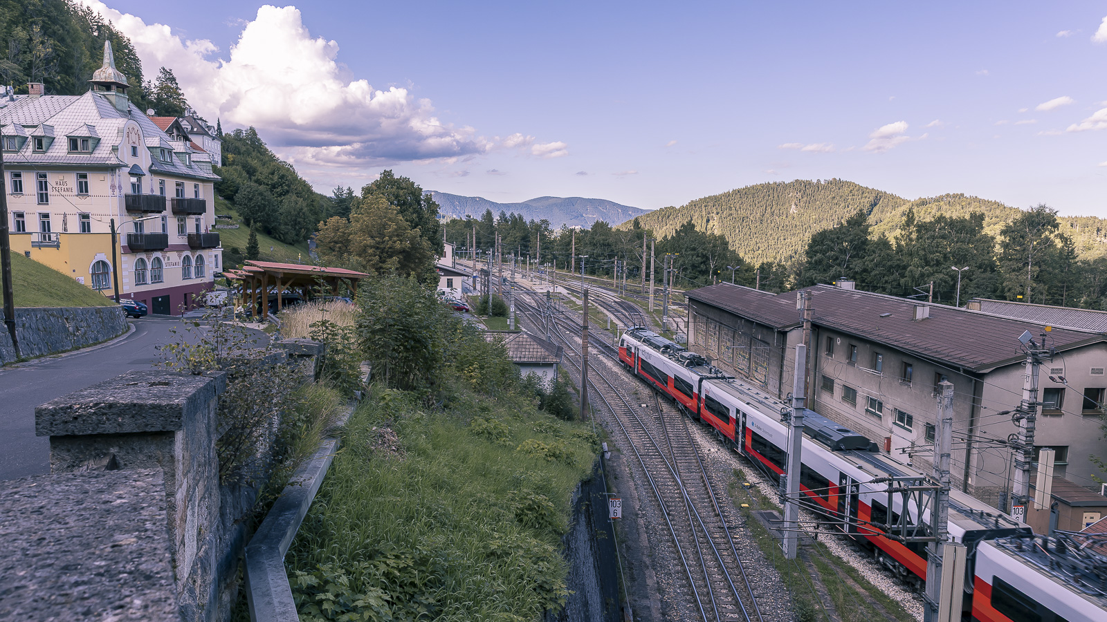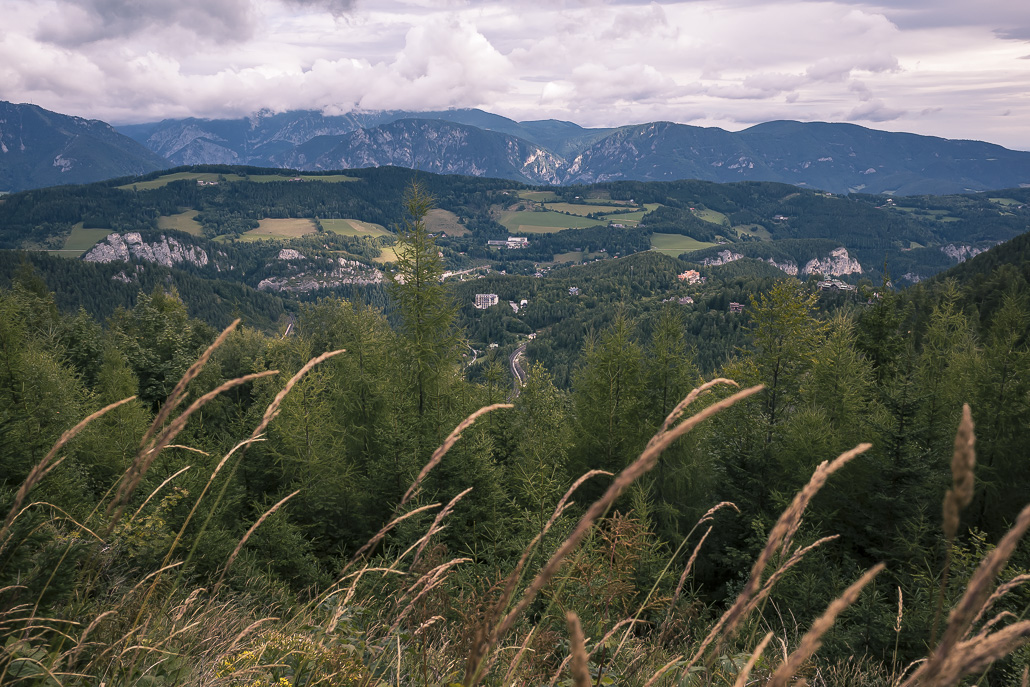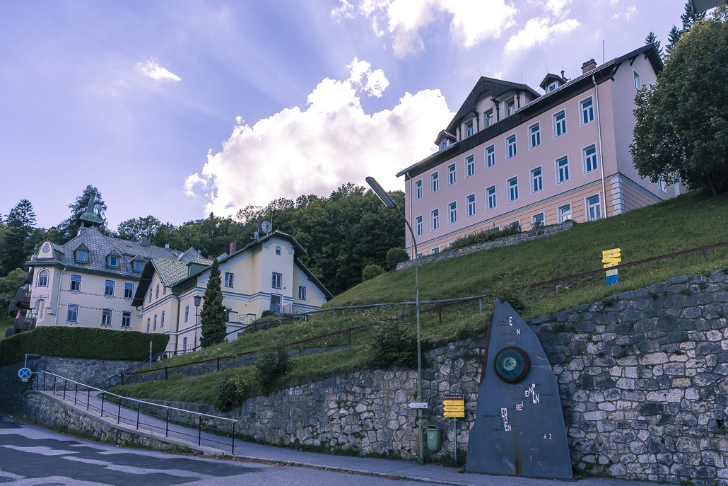 Vom Hotel Panhans geht es zunächst am historischen Gebäude vorbei, bevor der Weg in ruhige Waldabschnitte führt. Der Anstieg zum Pinkenkogel verläuft über einen schmalen Waldweg. Immer wieder öffnen sich kleine Lichtungen mit Ausblicken auf die Semmeringbahn, die zum UNESCO-Welterbe gehört.
