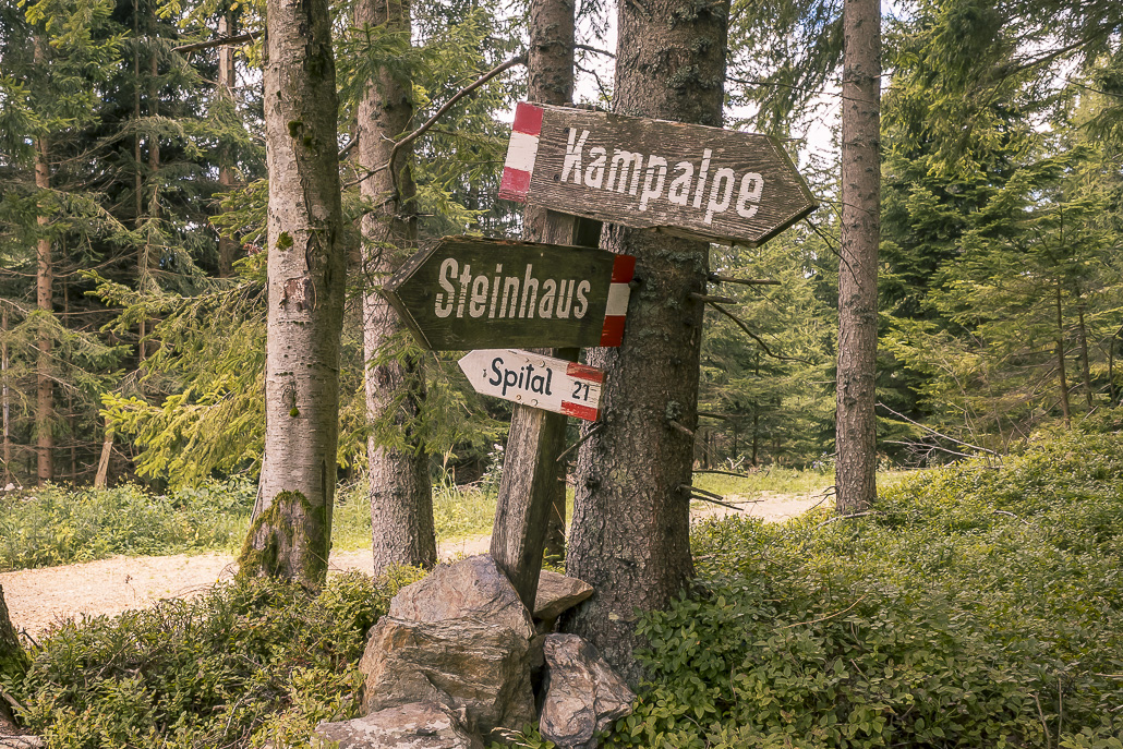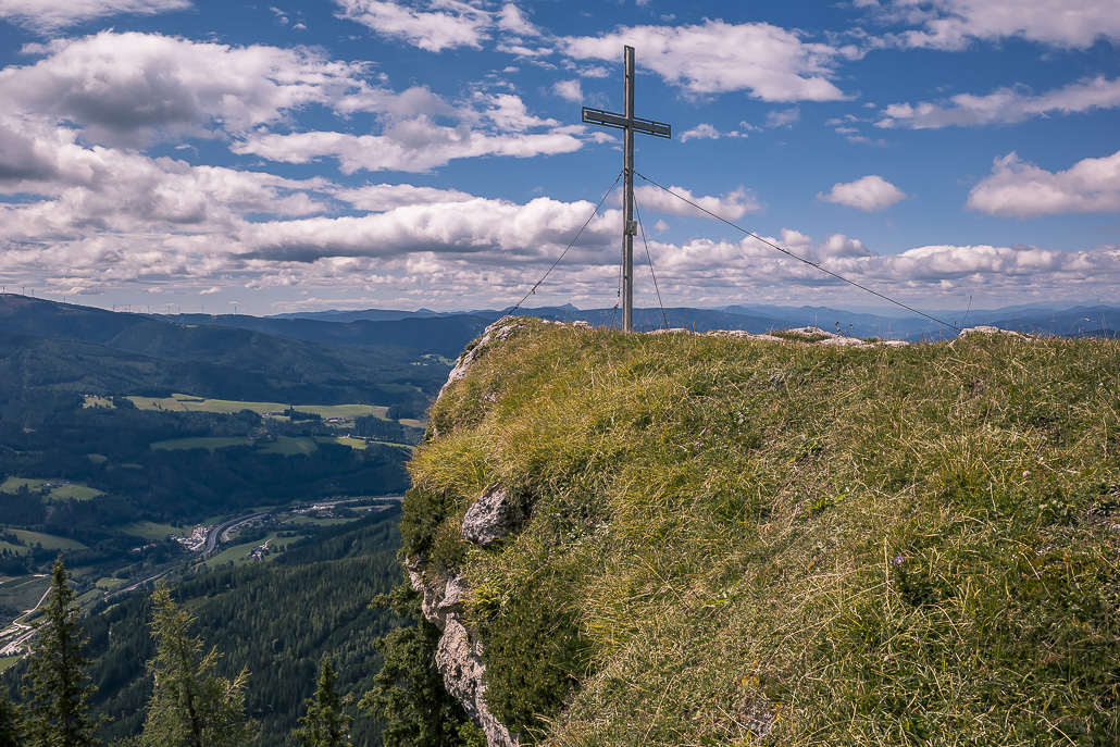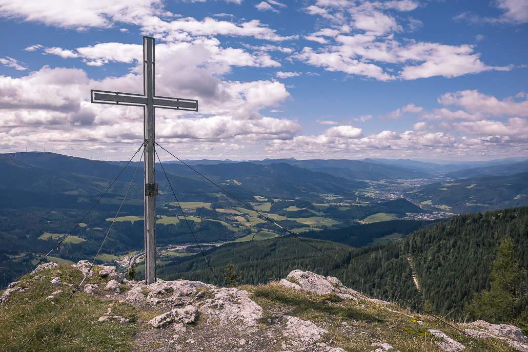 Nach dem Pinkenkogel folgt man dem Höhenrücken weiter in Richtung Kampalpe. Dieser Abschnitt ist geprägt von langen Waldpassagen. Der leichte Anstieg wird immer wieder durch kurze bergab führende Passagen unterbrochen. Je nach Jahreszeit zeigen sich unterschiedliche Stimmungen, von sattem Grün bis zu klaren Fernsichten in der kühleren Zeit. Auf der Kampalpe mit dem markanten Gipfelkreuz wird man mit einer sehr schönen Aussicht ins Mürztal und auf die Gipfel der Umgebung wie Stuhleck, Veitsch, Schneealm, Rax und Schneeberg für den Aufstieg belohnt.